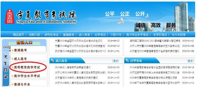 1、考生进入宁夏教育考试院官网(http://www.nxjyks.cn),在网站首页左侧考生登录入口,选择“高等教育自学考试”,进入宁夏高等教育自学考试网上报名系统登录页面。