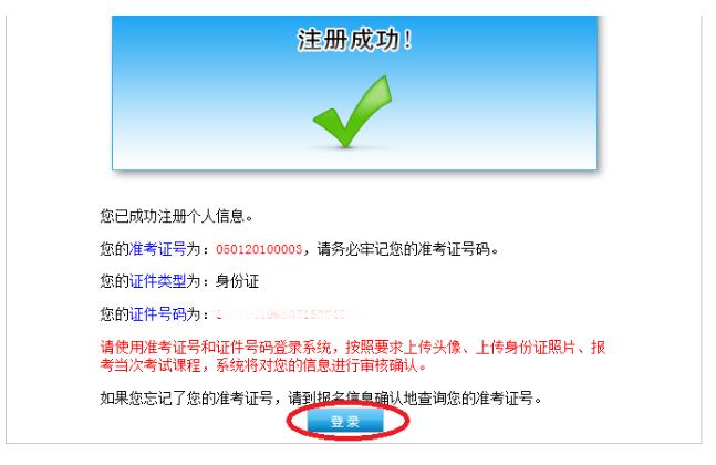 6、系统会为新注册的考生分配准考证号码,请考生务必记牢。单击“登录”按钮,进入宁夏高等教育自学考试网上报名系统。
