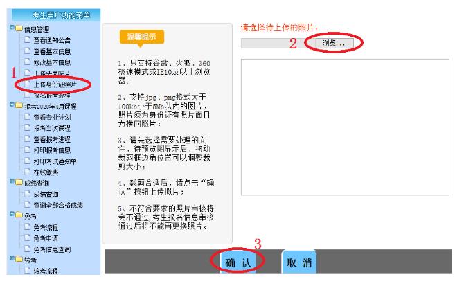 8、在报名系统左侧菜单栏中选择“上传身份证照片”,上传个人身份证件电子照片(头像面)。