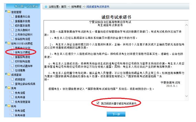 9、在报名系统左侧菜单栏中选择“报考当次课程”,阅读考生诚信考试承诺书。阅读结束以后勾选“我已阅读并遵守诚信考试承诺书”,进入课程报考页面。