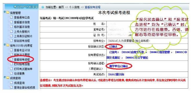 11、在报名系统左侧菜单栏中选择“查看报考进程”,查询报考情况以及审核进展。当“报名确认状态”和“报考确认进程”均为“已确认”时方可进行在线缴费。
