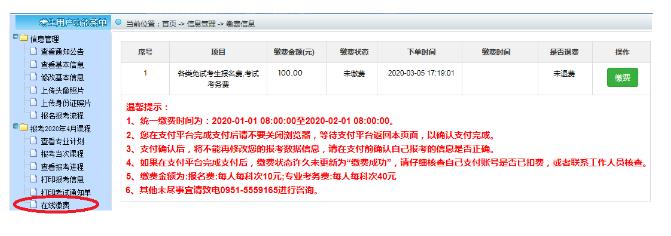 12、在报名系统左侧菜单栏中选择“在线缴费”,核对报考金额,确认准确无误以后,单击“缴费”按钮,完成报考费用缴纳。